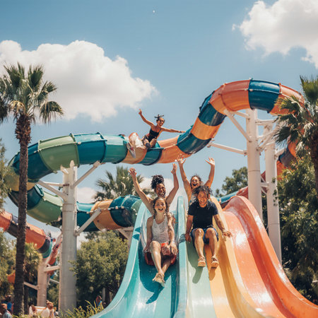 Families enjoy a thrilling experience at a lively water park, sliding down colorful water slides into a refreshing pool under a bright blue sky filled with fluffy clouds.