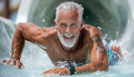 Smiling grey haired man enjoying a summer vacation, joyfully sliding down a waterslide at an aqua park, embracing fun and excitement