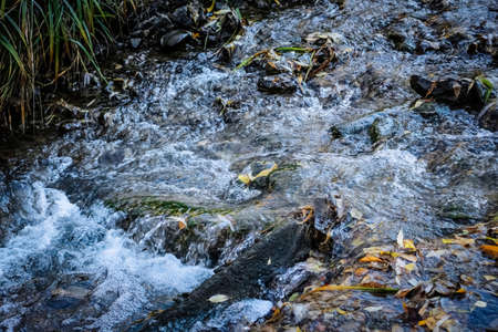 Streaming water in a small river, close-up. Natural background
