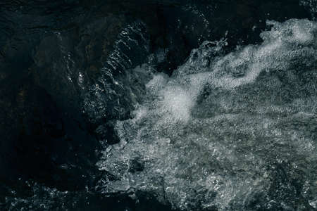 Nature background of dark water stream of mountain river with rapids. Full frame of sea surf. Natural textured backdrop of ocean surf. Texture of tide close-up. Dark water surface of mountain creek.