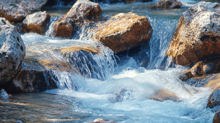 Vibrant blue streams cascade swiftly over rugged rocks, creating lively splashes that emphasize movement and vitality within a pristine, natural setting.