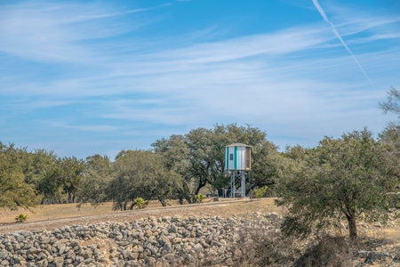 Watch tower against trees and blue sky on a sunny day in Lake Austin Texas. Outdoor landscape near a lake with a small building construction designed for watching the surrounding area.