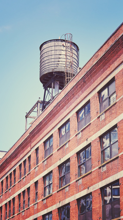 Vintage toned picture of a rooftop water tank on a New York city apartment building, USA.