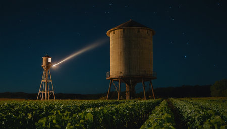 Water tower tank, providing a rural area with fresh water, from high above, under an expansive blue sky for copy space.