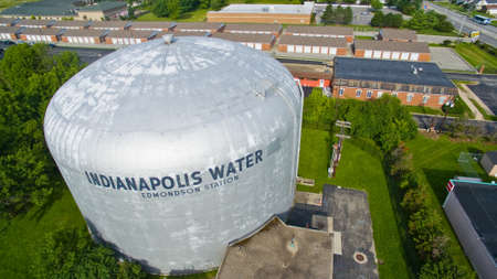 Aerial shot of the Indianapolis Water filtration plant Edmonston Station surrounded by trees and a few red brick buildings