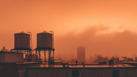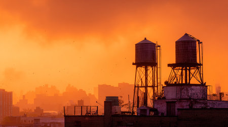 Retro toned picture of three water towers on an old industrial building rooftop, New York City, USA.