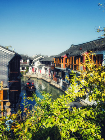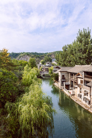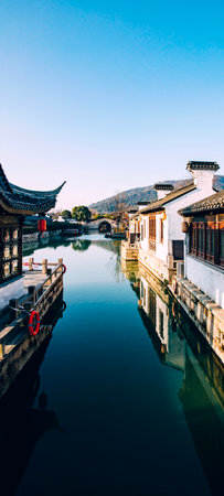 Gubei, China - October 4, 2025: Gubei Water Town landscape with calm canal, old architecture, greenery and distant mountains under clear sky in China. Vertical photo