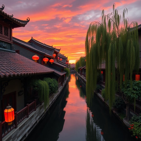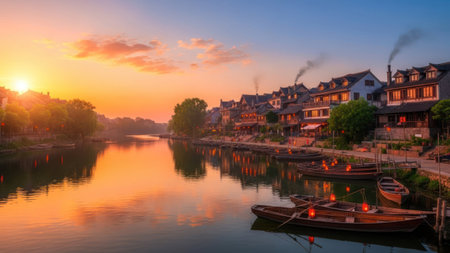A scenic riverside village scene unfolds during sunset, featuring traditional buildings with boats docked along the calm water. The composition is bathed in warm hues, with orange and yellow sky reflecting across the water surface. Smoke rises gently, suggesting activity within the dwellings, creating a serene environment.