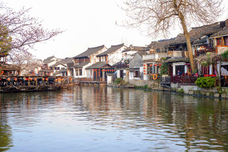 Zhujiajiao, China - November 15 2019: Traditional houses along the Grand Canal in the water town, Zhujiajiao, Shanghai, China