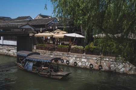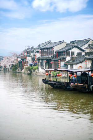 China traditional tourist boats at Shanghai Zhujiajiao town with boat and historic buildings, Shanghai China