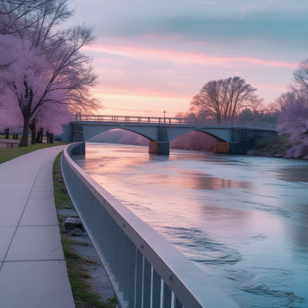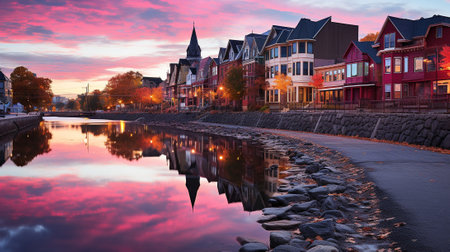 A serene river winds past rugged stones, surrounded by vibrant autumn leaves, with charming cottages nestled against a gentle sky glow.