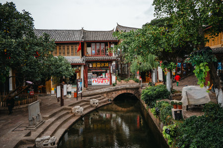 A quiet stone-lined canal winds through Lijiang Old Town, flanked by leafy trees, flowers, and charming wooden buildings under cloudy skies.