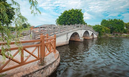 A picturesque waterside scene features a stone bridge arched over calm water. Sunlight filters through the overhanging green trees creating a contrast of light and shadow. This image presents an outdoor setting, ideal for illustrating nature or travel themes and suitable for a variety of commercial uses.