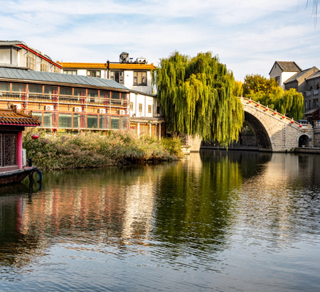 TAIERZHUANG, SHANDONG - JULY 1, 2019: Taierzhuang is located in Zaozhuang in Shandong, is the largest water town in China. Historically, it was an important hub along the Grand Canal, China.