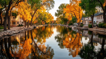A picturesque autumn scene featuring a canal lined with trees displaying vibrant fall colors, perfectly reflected in the calm water.