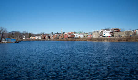 View of the backyard of the buildings on the main street of Magog from the other side of the river