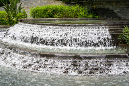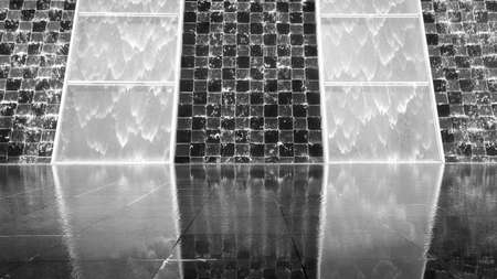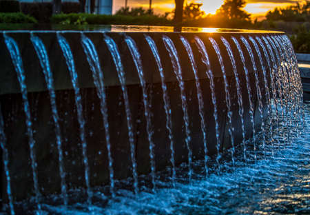 Water on the steps of the fountain. Transparent water streams splash and drain into the bowl of the fountain.