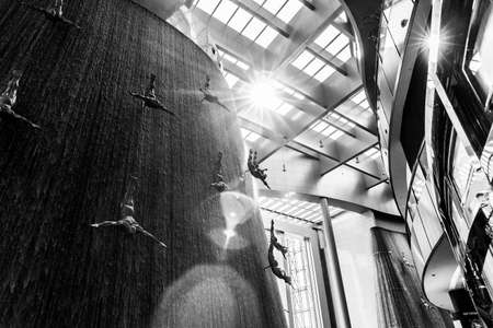 Dubai, UAE - January 25, 2020: Black and white high contrast picture of the waterfall inside the Dubai Mall on January 25, 2020 in Dubai, UAE.