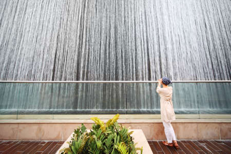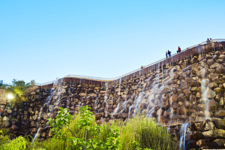 Dushanbe, Tajikistan - 16th november, 2024: Artificial stone waterfall with tourists on upper viewpoint terrace in public Rudaki park, Dushanbe