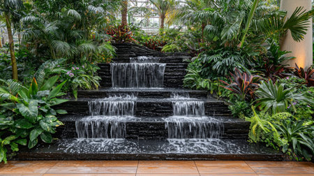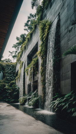 A striking modern building facade features multiple cascading waterfalls integrated into the stonework. Abundant greenery, including ferns and other plants, adds texture and contrast. The composition highlights geometric lines and a vertical format under daylight conditions. Suitable for use in architectural projects and environmental design concepts.