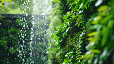 A water fountain surrounded by lush plants in a garden setting, Incorporate water-saving features like rainwater harvesting systems or greywater recycling