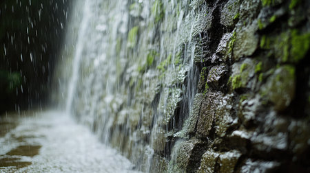 Rainwater cascading down a stone wall, forming miniature waterfalls along its rough texture