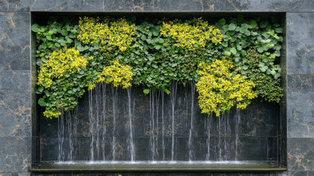 A stunning vertical garden featuring vibrant yellow flowers and lush greenery with gentle waterfalls creates a calming atmosphere in an urban setting. Perfect for modern spaces.