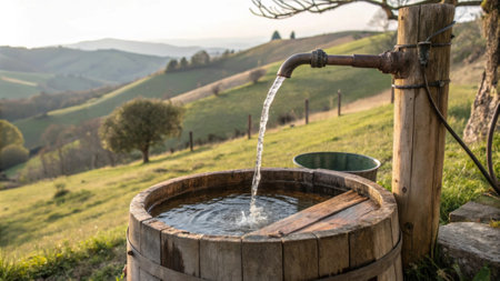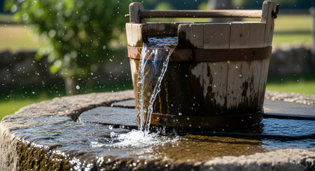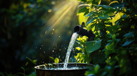 A serene image of water flowing from a rustic faucet into a vintage bucket, surrounded by vibrant greenery, illuminated by sunlit rays.