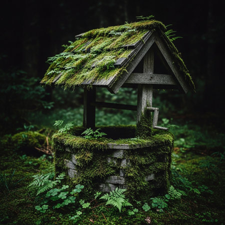 Old well with moss in the forest. Dark background. Selective focus.