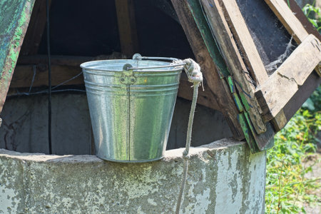 Caucasian hand drawing water from wooden well with metal bucket