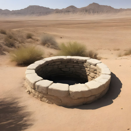An old stone well stands in the middle of a dried desert landscape. Cracks in the ground and the endless sandy horizon emphasize the aridity and the existential importance of water in this place.