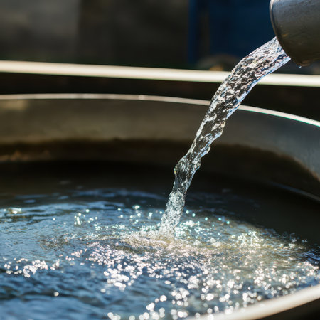 Clear water streams from a pipe into a large circular metal container under bright natural light creating ripples on the surface.