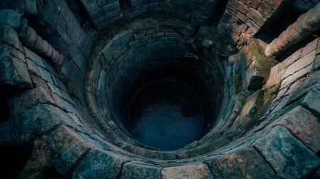 Gazing down into the dark, circular opening of an ancient stone well. The rough, weathered stones tell a story of generations past, leading to a mysterious reflection in the deep water below.
