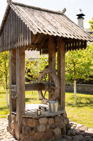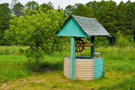 Real acting wooden well in the countryside in summer.