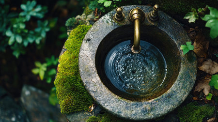 Top view of a vintage brass tap in an outdoor setting, with water dripping into a stone basin, surrounded by moss and leaves.