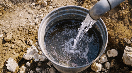 Top view of an industrial-style outdoor tap with water flowing into a metal bucket, surrounded by dry earth and rocks in a rural setting.