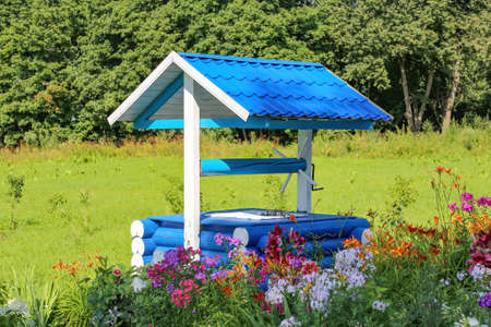 Beautiful wooden well made of blue logs and tiles among flowers and trees