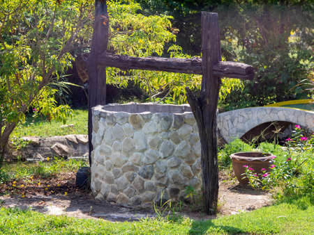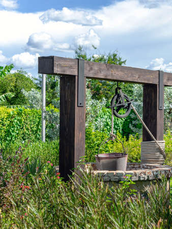 Old water well in the garden. draw well in european village. country side lifestyle