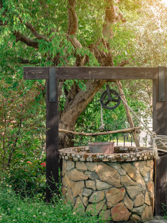Beautiful artesian well made by stones and wheel pulley with metal bucket and rope in peaceful garden atmosphere. Retro stone water well in rural area. Garden decoration with antique items.
