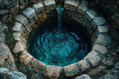 An old stone structure encircles a pristine blue water basin, evoking historical charm and tranquil ambiance in a rustic setting.