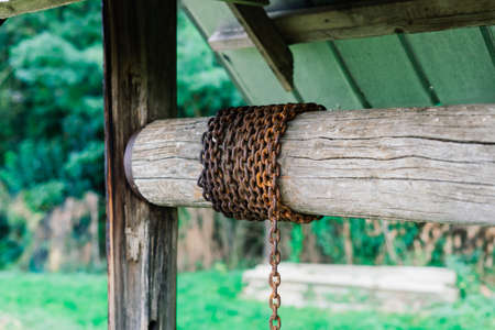 Modern Rustic Wooden Water Extraction Well Rusty Chain