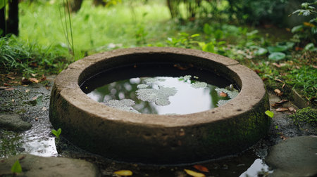 A serene circular stone water basin filled with clear water, reflecting the lush greenery around it. Perfect for garden enthusiasts seeking tranquility and beauty.