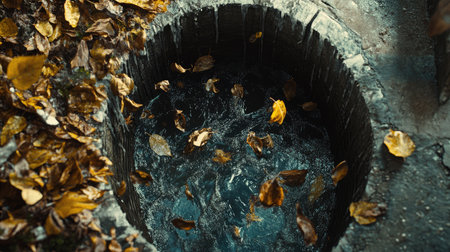 Drain clogged with debris and swirling rainwater, leaves and dirt accumulating in a chaotic mess