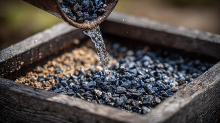 A captivating image of water pouring from a container into a dark blue barrel, showcasing the dynamic motion and shimmering surface of the liquid.