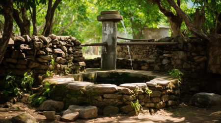 An historic stone structure featuring a gently flowing water source nestled amidst weathered brickwork, evoking timeless rustic charm and rural tranqu