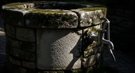 A close-up view of an old, moss-covered stone well with a weathered metal spigot, bathed in dappled sunlight.
