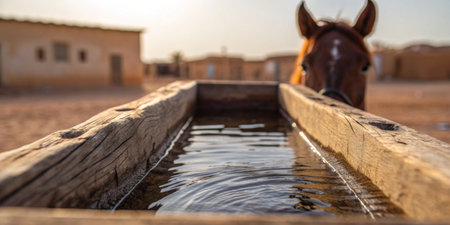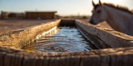 Golden sunlight bathes a wooden water trough as a horse approaches to drink in the desert.
