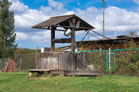 An old manual well with drinking water. Background with copy space for text or inscriptions.