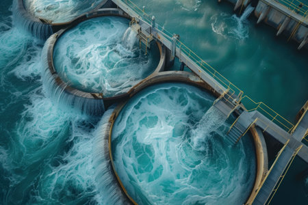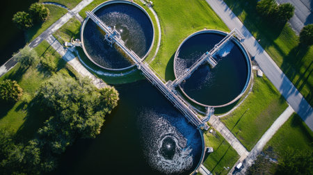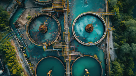 A captivating aerial view of circular water treatment tanks showcasing modern wastewater management, emphasizing flow, infrastructure, and environmental sustainability.