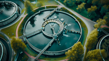 A high-angle shot showcases a wastewater treatment facility featuring circular tanks, surrounded by lush greenery, highlighting the balance of industrial and natural elements.